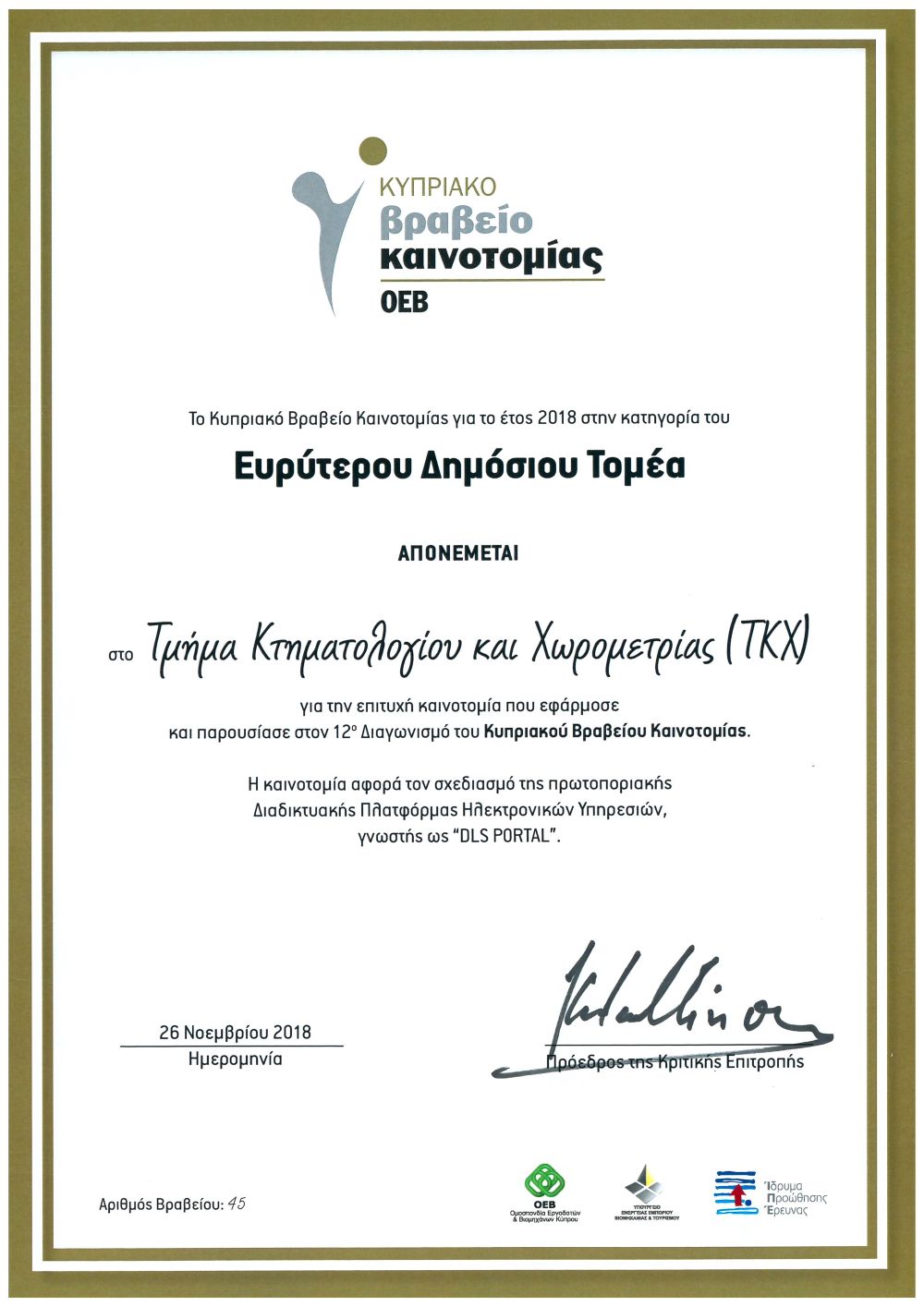 Κατά τη διάρκεια μιας λαμπρής τελετής, η οποία πραγματοποιήθηκε στην Κεντρική Σκηνή του ΘΟΚ στη Λευκωσία στις 26 Νοεμβρίου 2018, από την Ομοσπονδία Εργοδοτών και Βιομηχάνων (ΟΕΒ), απονεμήθηκαν τα «Βραβεία Καινοτομίας και Έρευνας ΟΕΒ 2018». Στο πλαίσιο των «Βραβείων Καινοτομίας ΟΕΒ 2018», το Βραβείο στον Ευρύτερο Δημόσιο Τομέα απονεμήθηκε στο Τμήμα Κτηματολογίου και Χωρομετρίας για τη δημιουργία της πρωτοποριακής Διαδικτυακής Πλατφόρμας Ηλεκτρονικών Υπηρεσιών, γνωστής ως “DLS PORTAL”. Το βραβείο παρέλαβε ο Διευθυντής του Τμήματος, κ. Ανδρέας Σωκράτους από την Α.Ε. τον Πρόεδρο της Κυπριακής Δημοκρατίας κ. Νίκο Αναστασιάδη. Στην τελετή παρέστησαν Υπουργοί, Βουλευτές, πολιτικοί και άλλοι πολιτειακοί αξιωματούχοι καθώς και μέλη της επιχειρηματικής κοινότητας. Την εκδήλωση τίμησαν με την παρουσία τους, ο έντιμος Υπουργός Εσωτερικών κ. Κωνσταντίνος Πετρίδης και ο Γενικός Διευθυντής ΥΠΕΣ κ. Κύπρος Κυπριανού.