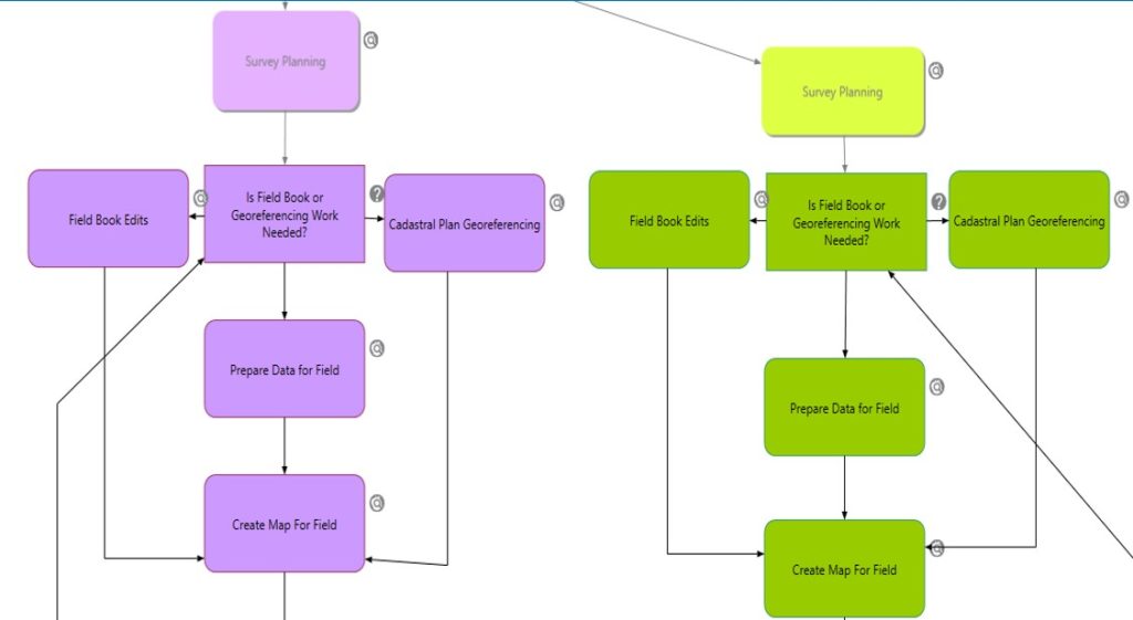 Οι εμπειρογνώμονες της ESRI, σε συνεργασία, με την Ελληνική εταιρεία MARATHON DATA SYSTEMS, με την ομάδα του GIS του Κλάδου Διαχείρισης και Υποστήριξης του ΣΠΓ, με πολλούς από τους Λειτουργούς του Κλάδου Χωρομετρίας του Τμήματος και με τη στήριξη από την ομάδα των συναδέλφων του Τμήματος Υπηρεσιών Πληροφορικής έχουν αναλύσει και μελετήσει όλες τις διεργασίες του Κλάδου μας και έχουν αναπτύξει όλα τα απαραίτητα σενάρια (Workflows), με τα οποία θα διεκπεραιώνονται όλες οι εργασίες του Κλάδου Χωρομετρίας.